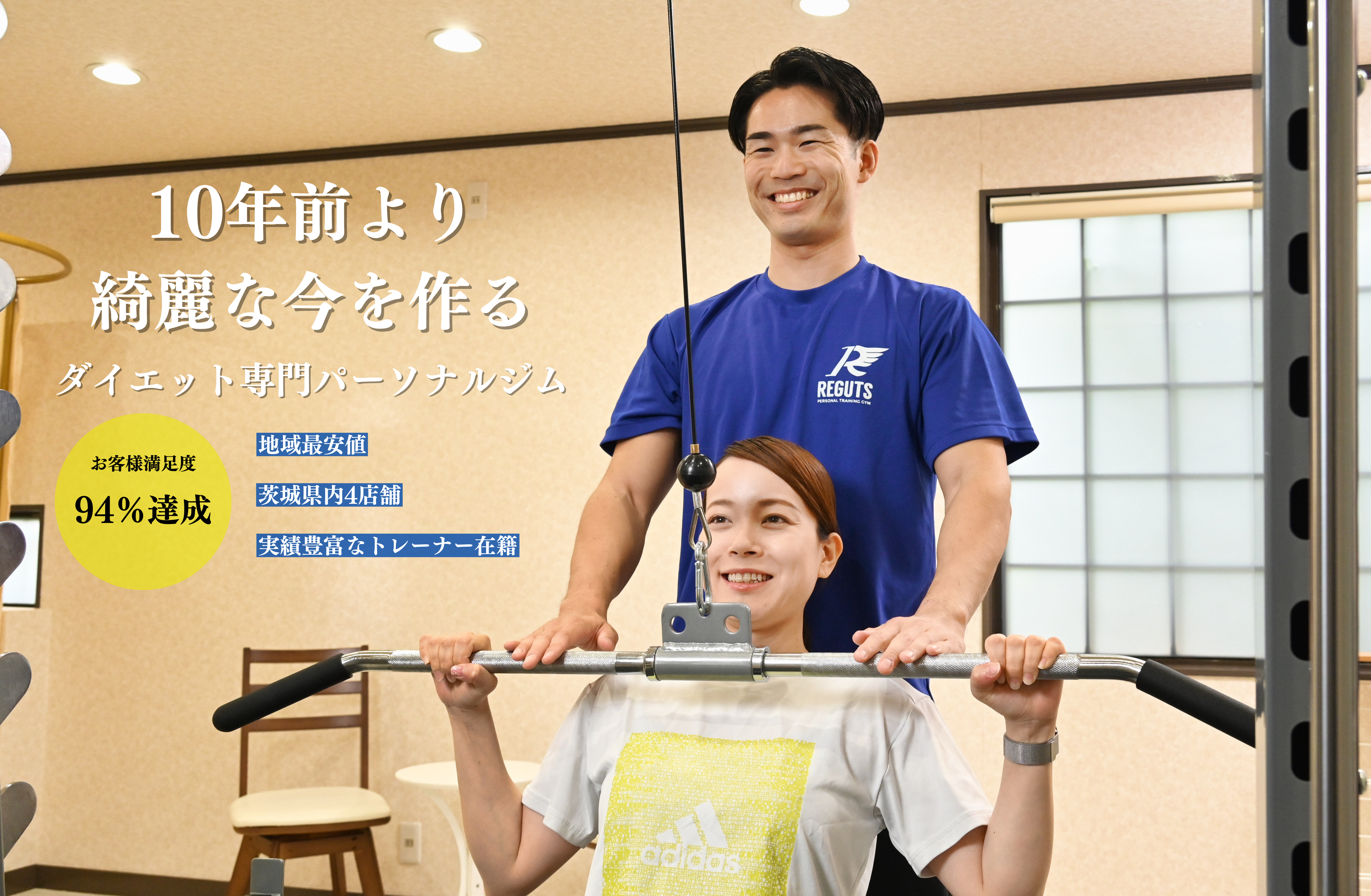 パーソナルジムREGUTS(リガッツ)つくば店は経験豊富なトレーナーが、あなたに合った栄養サポートとトレーニングを指導するパーソナルトレーニングジムです。