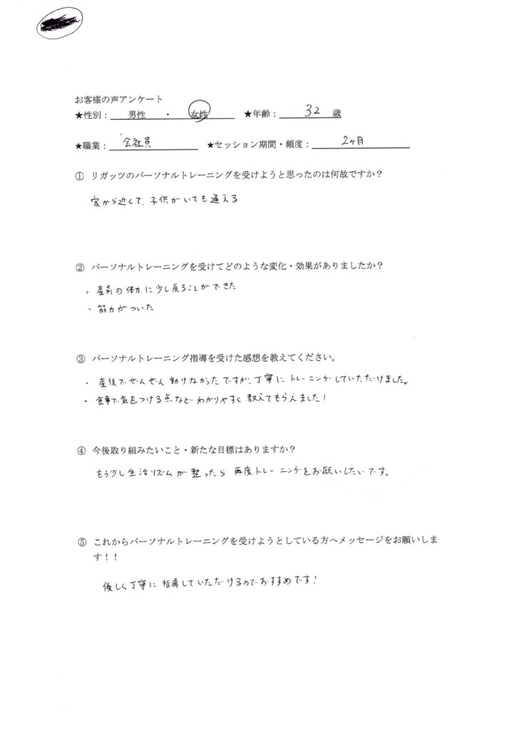 ・産後でぜんぜん動けなかったですが、丁寧にトレーニングしていただけました。