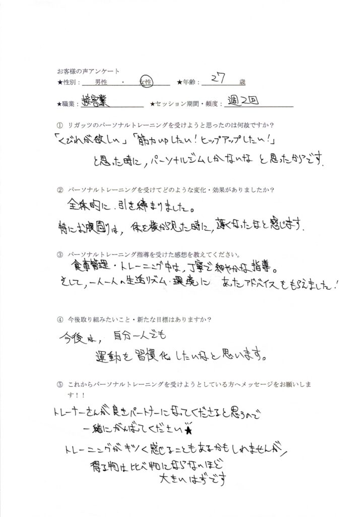 パーソナルトレーニング指導を受けた感想を教えてください。